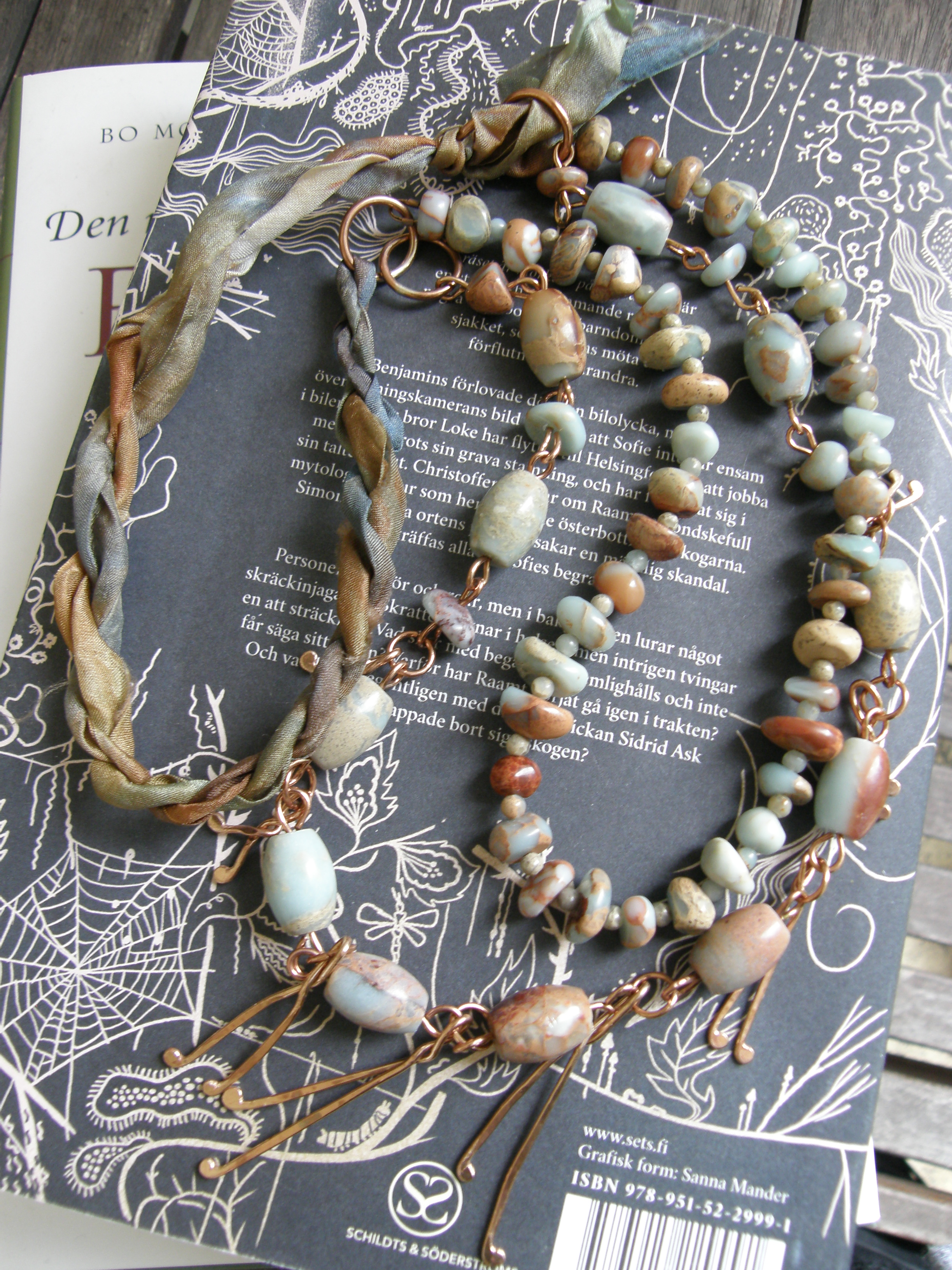 Här blev jag kanske lite väl kreativ… men om beställaren inte gillar alla detaljer, så är det ett mångsidigt halsband, som är lätt att modifiera. Sari-silkesbandet kan tas bort, så blir det enkelradigt, och fötterna/noterna går relativt lätt att pilla bort om man tröttnar på dem. Fördelen med silket är att längden går att justera, och så ska det vara väldigt skönt mot huden.