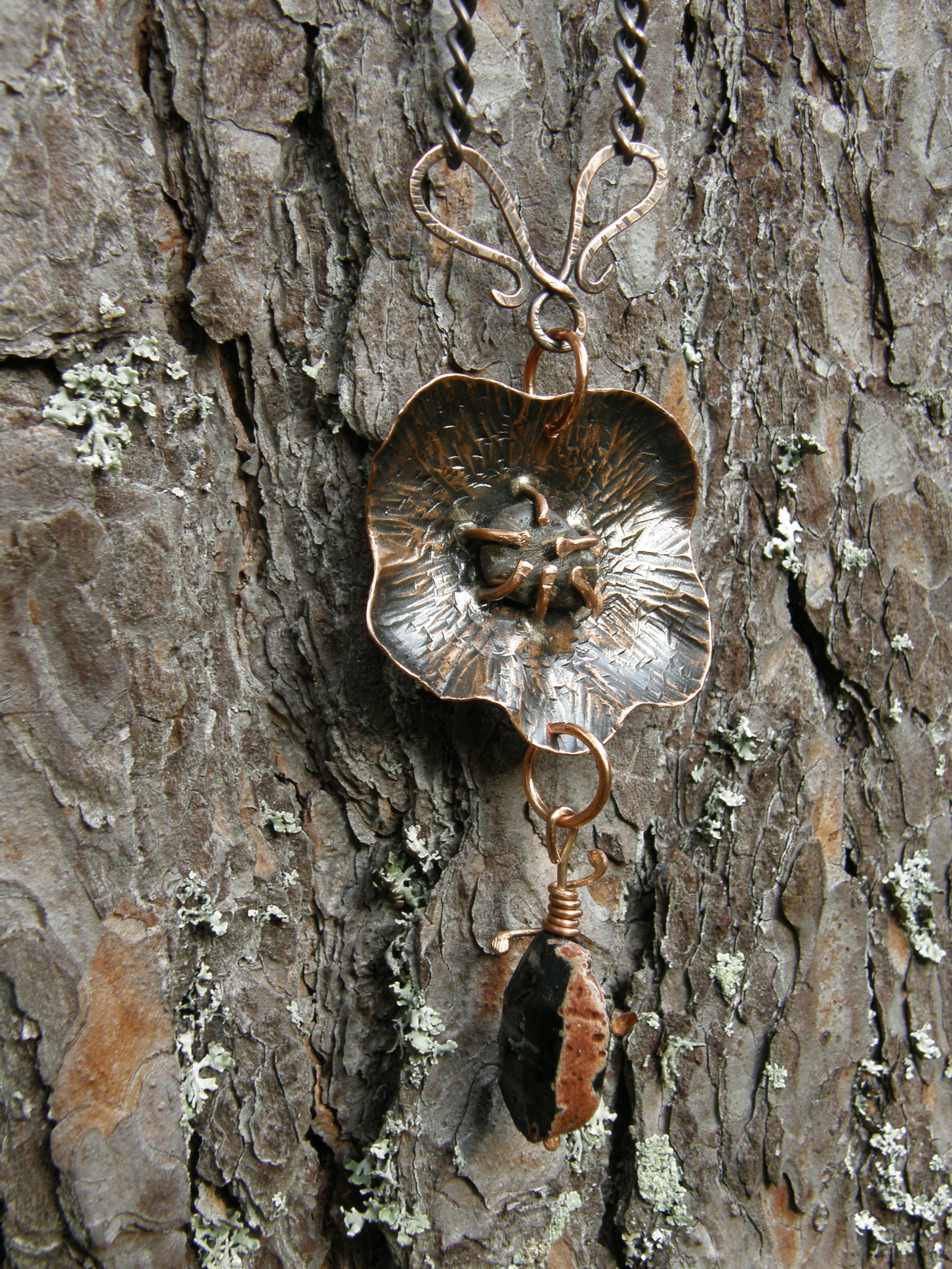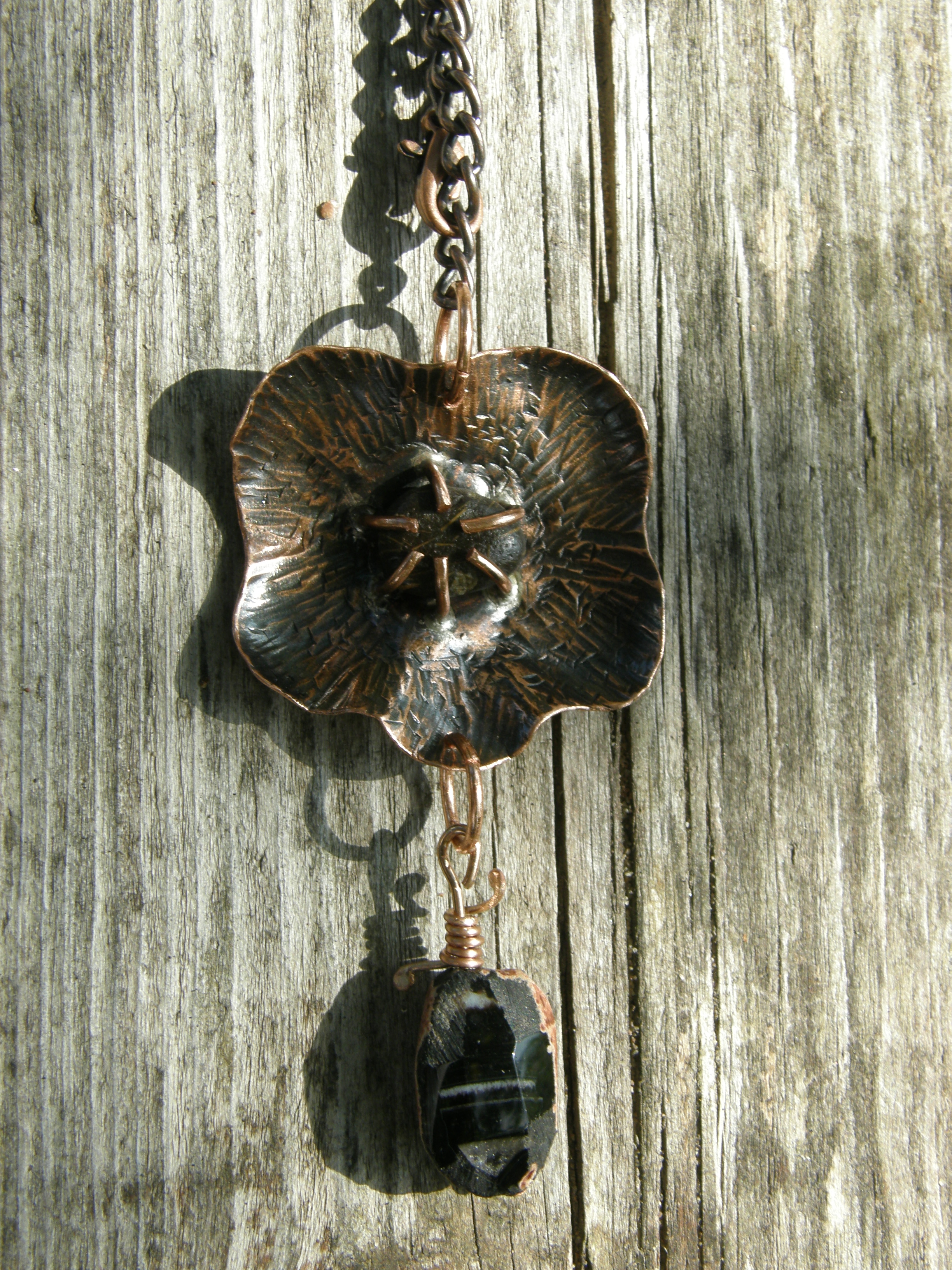 ”Blomma” i svärtad, lackad kopparplåt, med en vanlig sten (kan vara ur en påse sjösten för trädgården, eller från en Hangövägkant), hänge med agat och bronstråd. Ovan version ett, nedan lite omarbetad: den jäkeln snurrade bara runt på keden, så jag måste lägga en stabiliserande del emellan. Och de tvära ändarna på sten-infattningen såg inte heller bra ut, så det försökte jag fixa till.