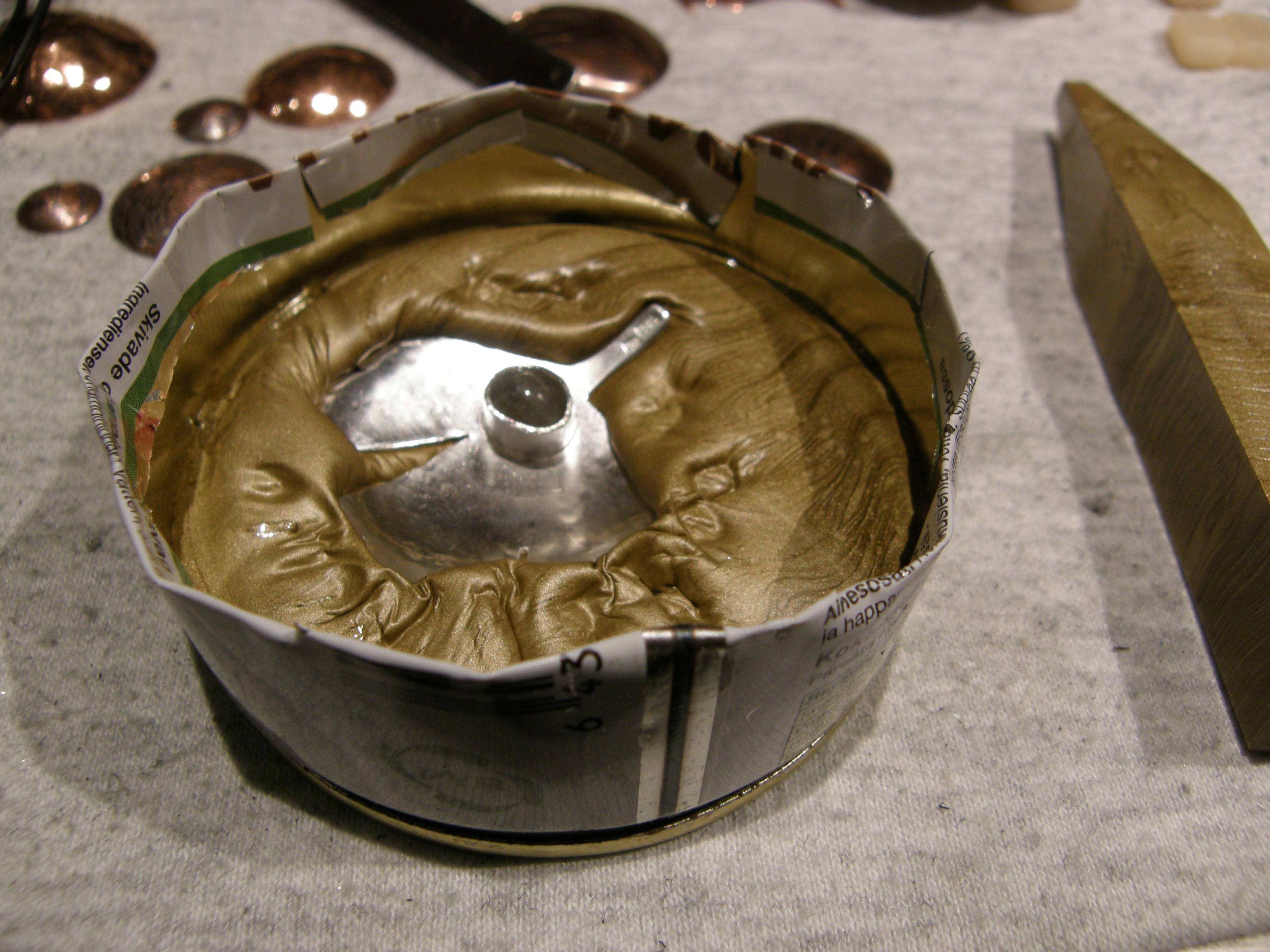 Del två av höstens silversmideskurs med Ru producerade de här bladen (en krypnäva, fast de mest påminner om marimekko-blommor). Silver är så underbart att forma, och jag tyckte det var dags att jag lärde mej infatta stenar. Jag valde extra hopplösa stenar förstås: ojämna nuggetar med hål tvärs genom, som måste döljas. Sen blev jag inte helt klar under kursen, själva infattningen fick jag klara av hemma! Det gick hyfsat, med lite julklappslack i en konservburk som fixering (tur att man samlar på allt!).