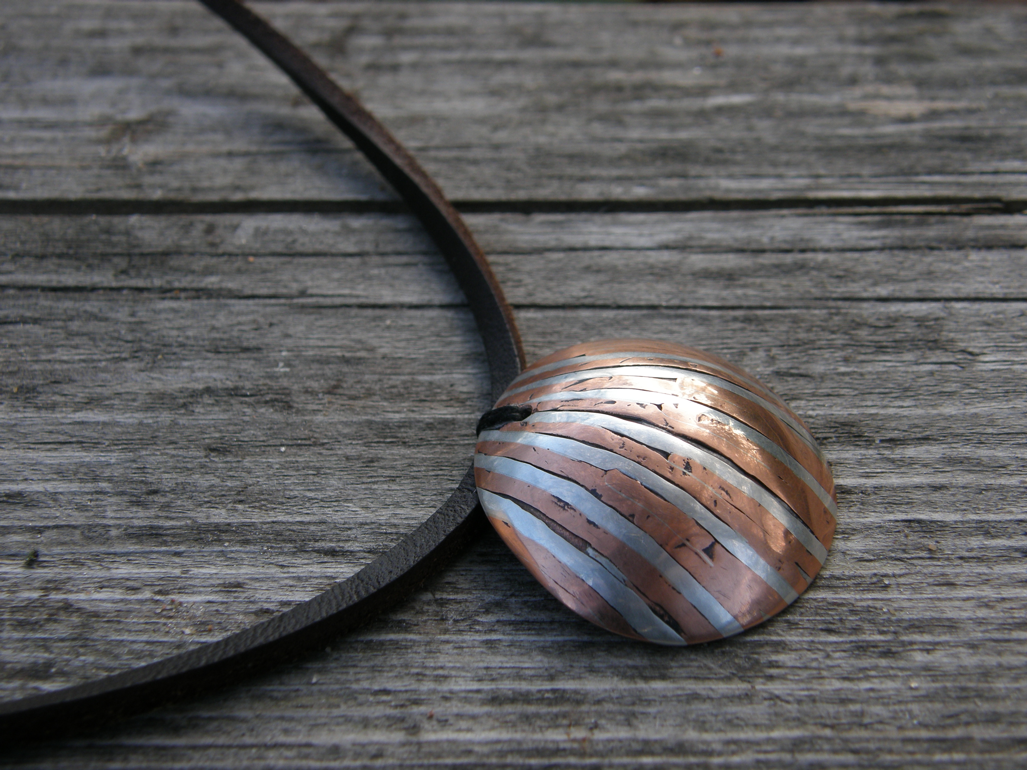 Jag hade först inte alls tänkt lägga ut det här halsbandet, för jag tyckte det blev lite för misslyckat, och jag tänkte att jag nog aldrig gör flera med samma teknik. Men jag ångrade mej på båda punkterna: jag har gjort flera (se t.ex. ”Rustikt hänge med sofistikerade pärlor”), och det här har blivit ett av mina absoluta favoriter. Jag läste lite metallsmidesteori igen, och måste testa… Det är alltså koppar-och silvertråd på en platta av koppar. (Baksidan lackad, ovansidan vaxad, för att skydda kopparn.)