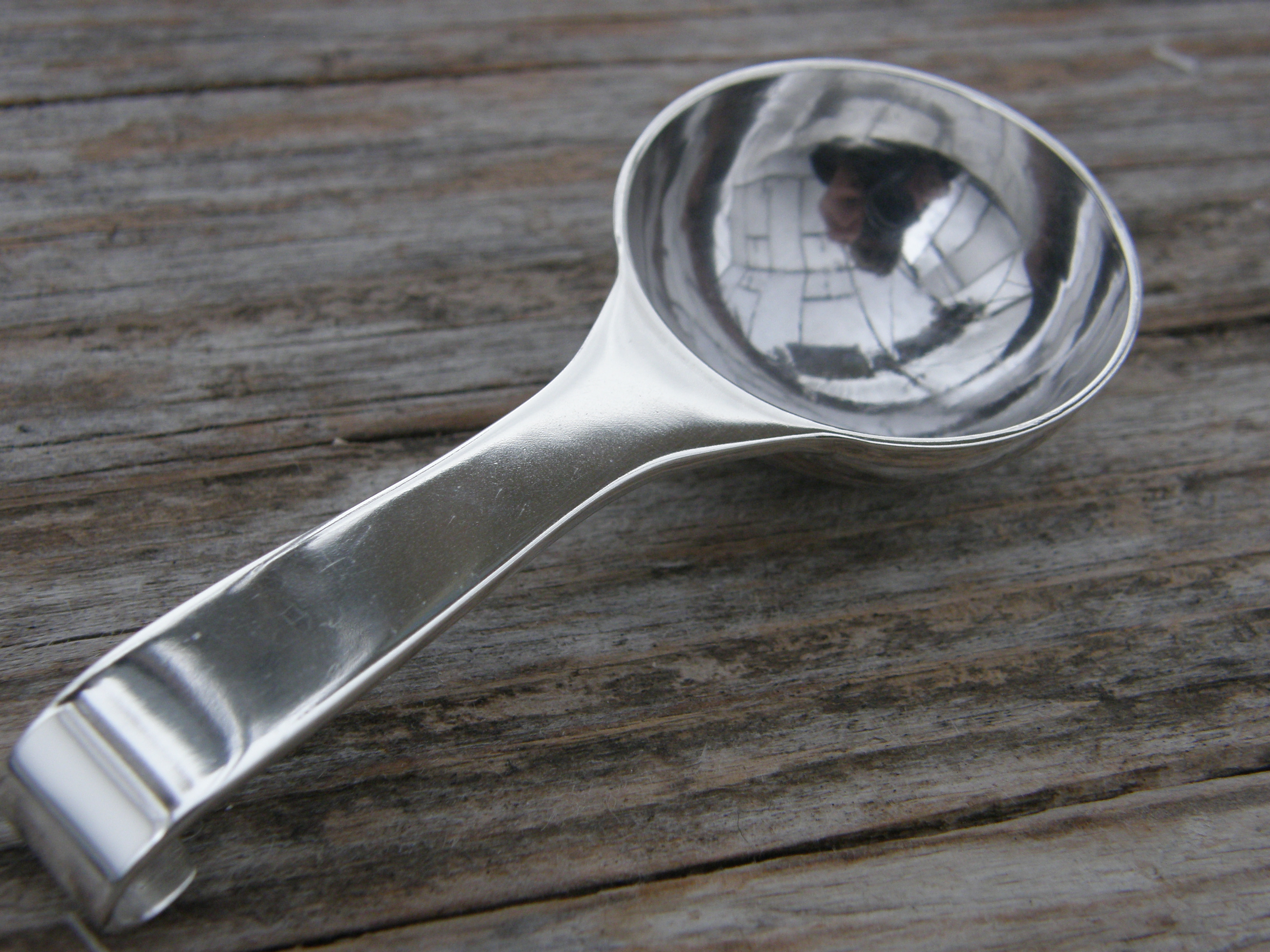 Ibland får jag beställningar på annat än smycken — här en kaffe-måttsked som jag delvis gjorde under höstens silversmideskurs på VNF (jag har inte ännu rätt verktyg hemma för att forma en så slät fördjupning). Lite missnöjd är jag med finishen lite här och där, och om nån undrar hur jag får rätt storlek på måttet, så är svaret: inte! Det här blev ganska litet, ujuj, ta rågade skedar! Men silver är härligt att jobba med…