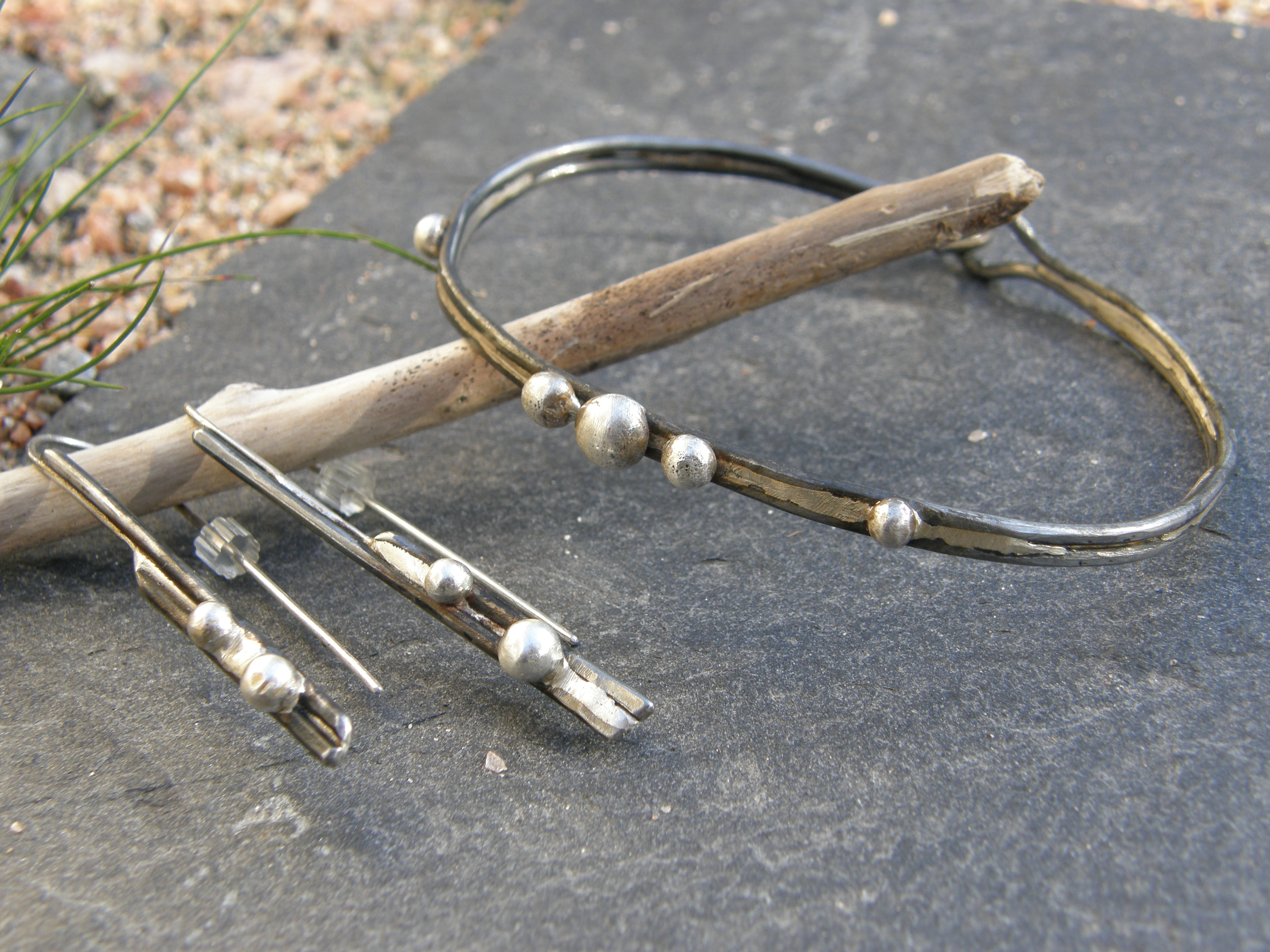 Här är ett matchande armband och örhängen till den föregående posten. Som jag kämpade… men lodet åkte iväg som på hal is åt fel håll, och sen seglade silverpärlorna iväg också, och i det glödheta skedet är min precision med platinastaven tyvärr inte den bästa. Men jag gillar dom ändå. Jag kunde göra hur många som helst, bara mina nerver inte blev så trasiga av spänningen, och så måste jag minska åtgången av silverlod, det blir så fult då jag måste fila bort klumparna.