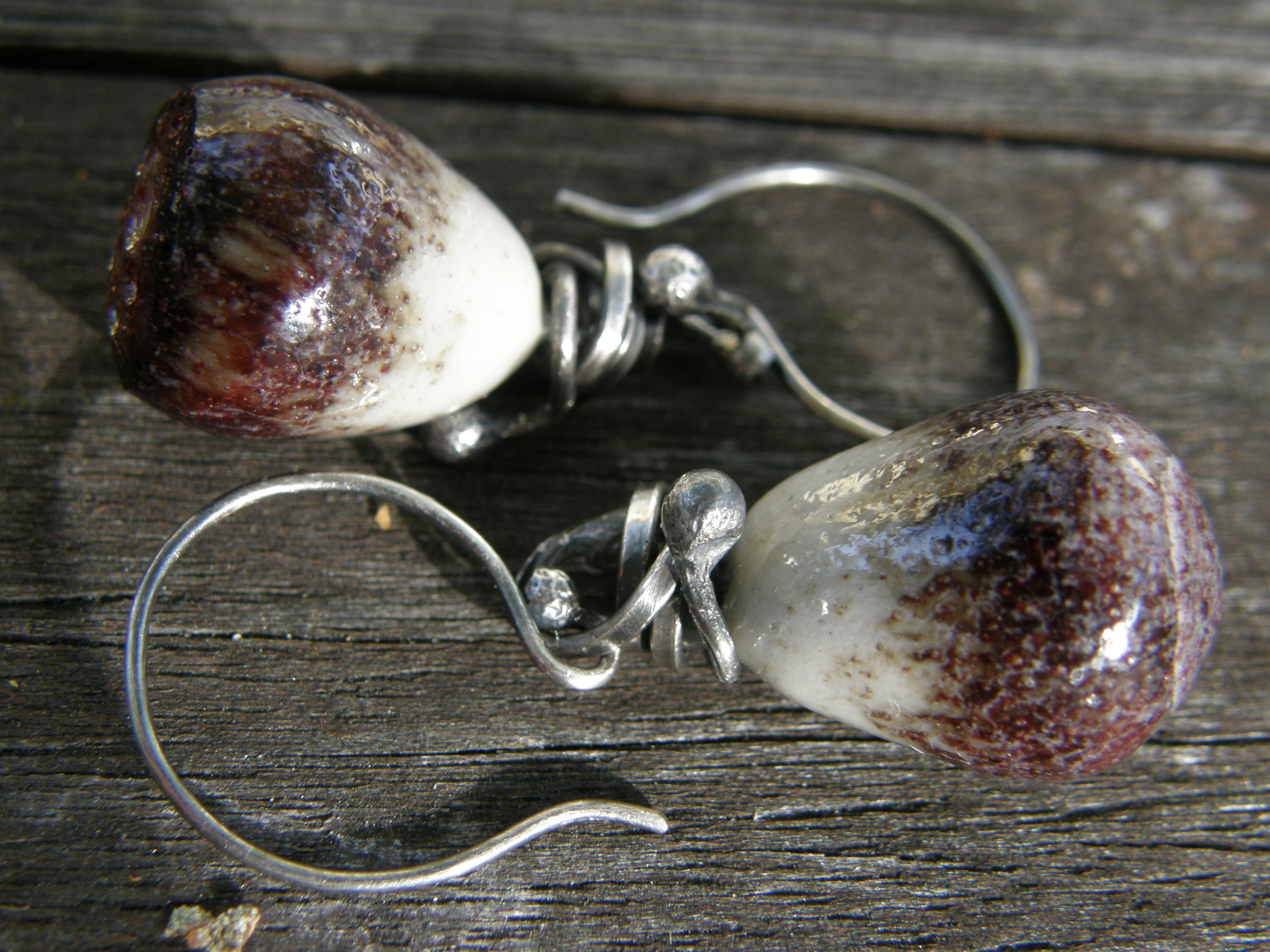 Mummy came with a bunch of newly fired ceramic beads that I’d glazed some month ago. My ceramics projects are nearly of the ”five-year-plan” kind, I get to the pottery studio that seldom — and then you have to wait for the kiln to fill up! Here a couple of earrings I wrapped up to sell at Sommaröhallen.
