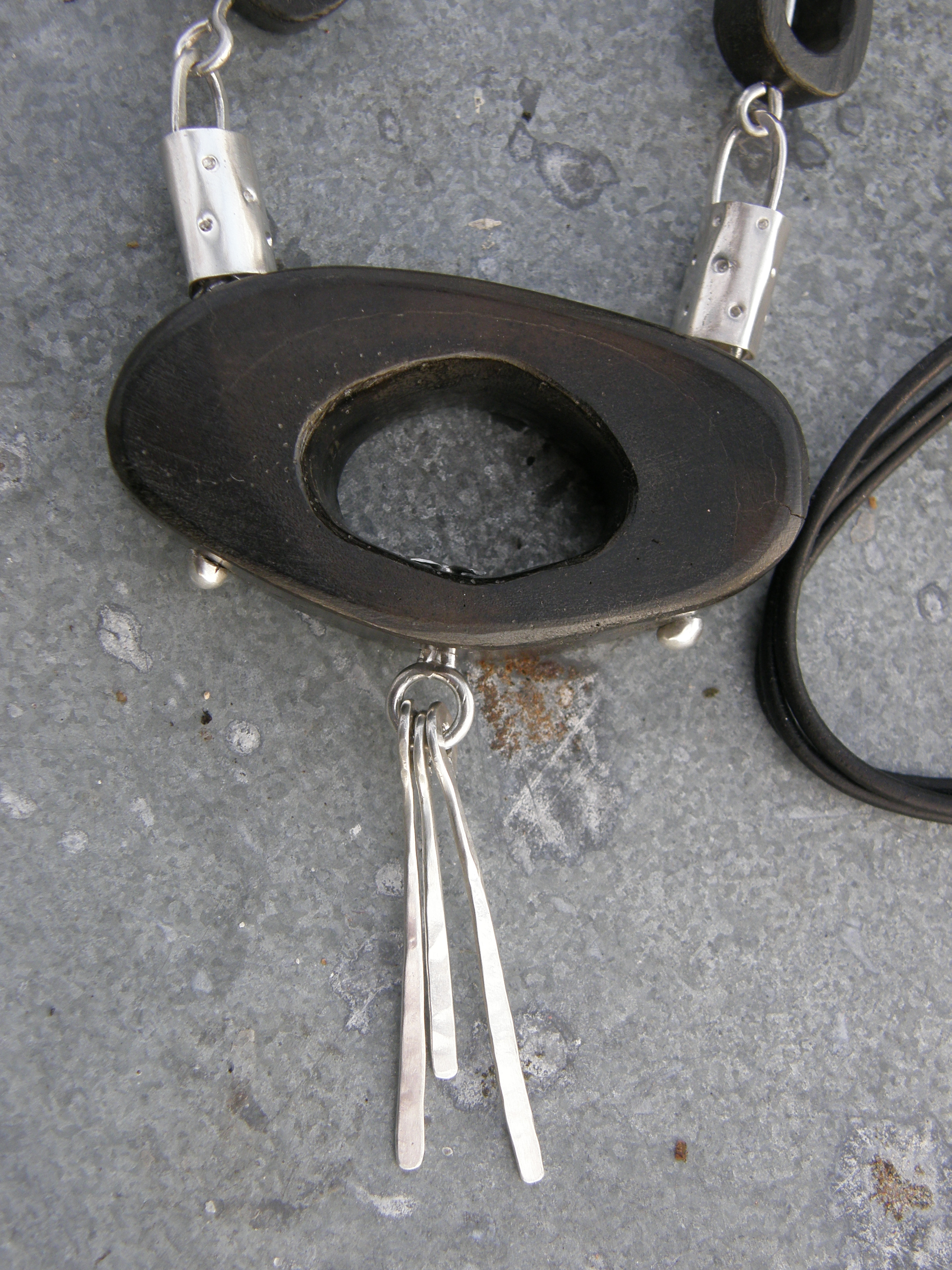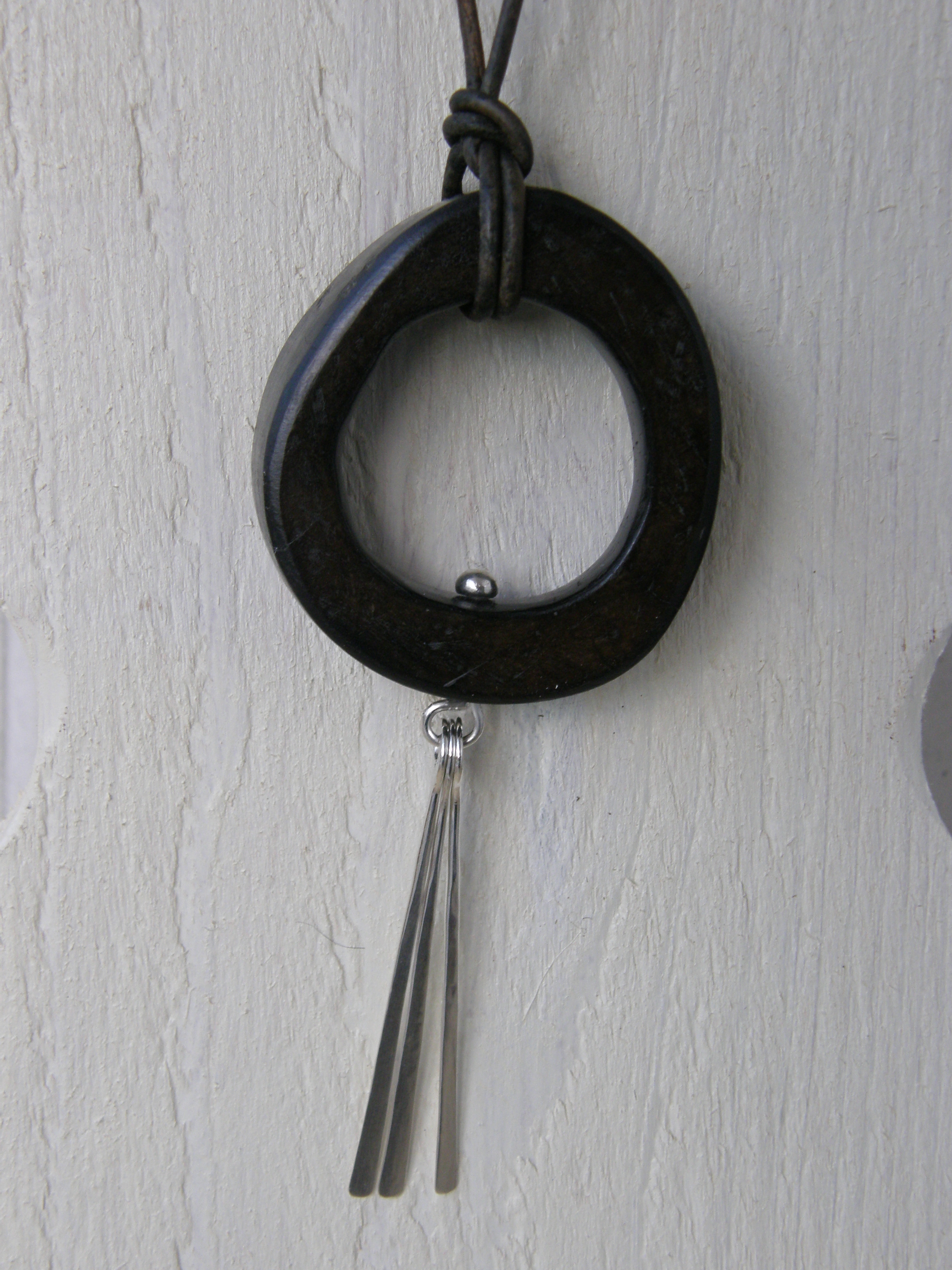 Here are a couple of necklaces in bone, silver and leather. It’s best to prepare the bone in the summer, at least the sawing and sanding, to avoid getting all the dust indoors. At the same time the garden gets fertilized… Here I’ve used organic beef (Koskis gård, leftovers from cooking meat stock, we bought the bones from Köttkontrollen). The small rounds are mutton from Ia Asen in Tenala (leftover from the Easter roast mutton…). The weight especially of the beef bone is impressive.