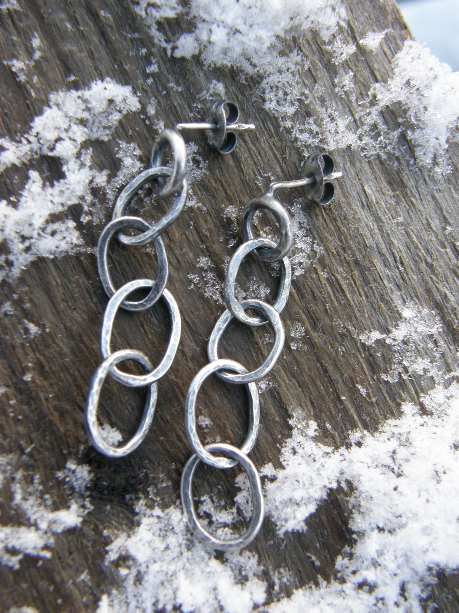 Man ska inte läsa för mycket modetidningar… eller så ska man. Nånstans såg jag ett par örhängen som liknade de här, en ganska grov kedja, förmodligen i guld, kanske Chanel eller så. Tänkte att nåt sånt kunde ju vara kul. Och så gick jag och underdimensionerade keden, genom att välja lite för tunn tråd (1,2 mm)! Borde ha varit 1,5. Tja, de blev iallafall lätta. Och diskreta. Iallafall ganska. Och tappens fästning kunde jag ju jobba på, men jag vet inte riktigt hur. Måste fråga Ru i juni!